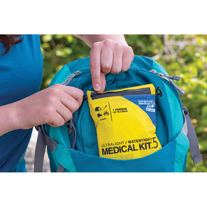 Dimensions: 5.5" x 11" x 1". Includes: (5) 1" x 3" Adhesive bandage; (3) Knuckle bandage; (2) Butterfly closure bandage; (2) 2" Conforming gauze bandage; (2) 2" x 2" Sterile gauze dressing; (2) 3" x 3" Sterile gauze dressing; (1) 3" x 4" Non-adherent sterile dressing; (11) Pre-cut and shaped Moleskin; (3) Safety pins; (1) Forceps; (2) After bite wipe; (2) Antihistamine (Diphenhydramine 25mg); (2) Aspirin (325mg); (2) Ibuprofen (200mg); (2) Acetaminophen (500mg); (6) Antiseptic wipe; (2) Alcohol swab; (1) Tape, 0.5" x 10yds; (1) Skin Tac Topical Adhesive wipe; (2) Triple Antibiotic Ointment, single use. Weight: 3.68oz. Comes in watertight case. Bulk packed.