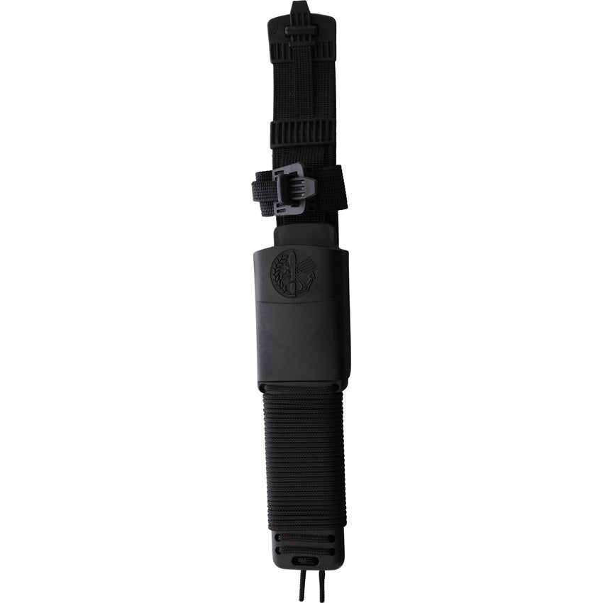 12.25" (31.12cm) overall. 7" (17.78cm) black finish sawback stainless blade. Black checkered aluminum handle. Lanyard hole. Hollow handle contains survival kit with fishing kit, sewing kit, scalpel, compass, tweezers, and dressings. Black polymer belt sheath. Boxed.