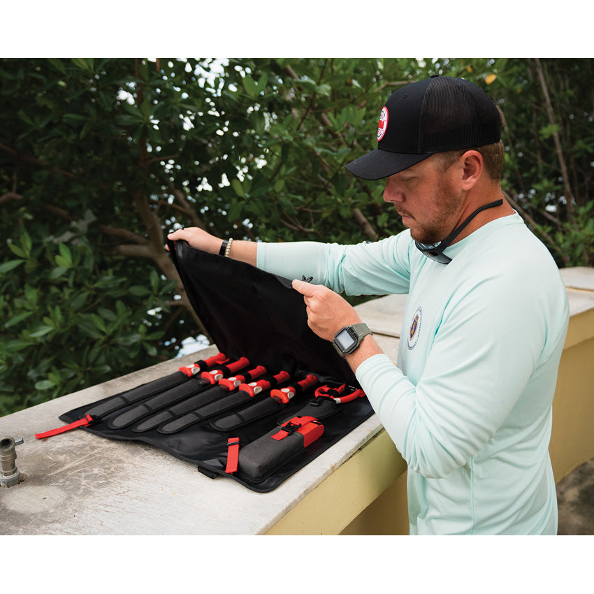 Dimensions: 21.5" x 8.25". Holds (1) Large knife up to 12" overall; (3) Medium knives up to 9" overall; (1) small knife up to 7" overall; (1) Shears; (1) Sharpener; (1) Pocket sleeve. 29-53" adjustable shoulder strap. Velcro straps. Bulk packed.
