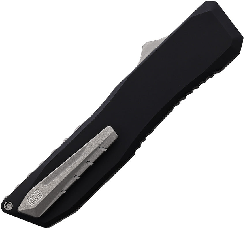 Automatic opening. 5.38" (13.67cm) closed. 3.75" (9.53cm) stonewash finish CPM-20CV stainless tanto blade. Black anodized aluminum handle. Pocket clip. Boxed.