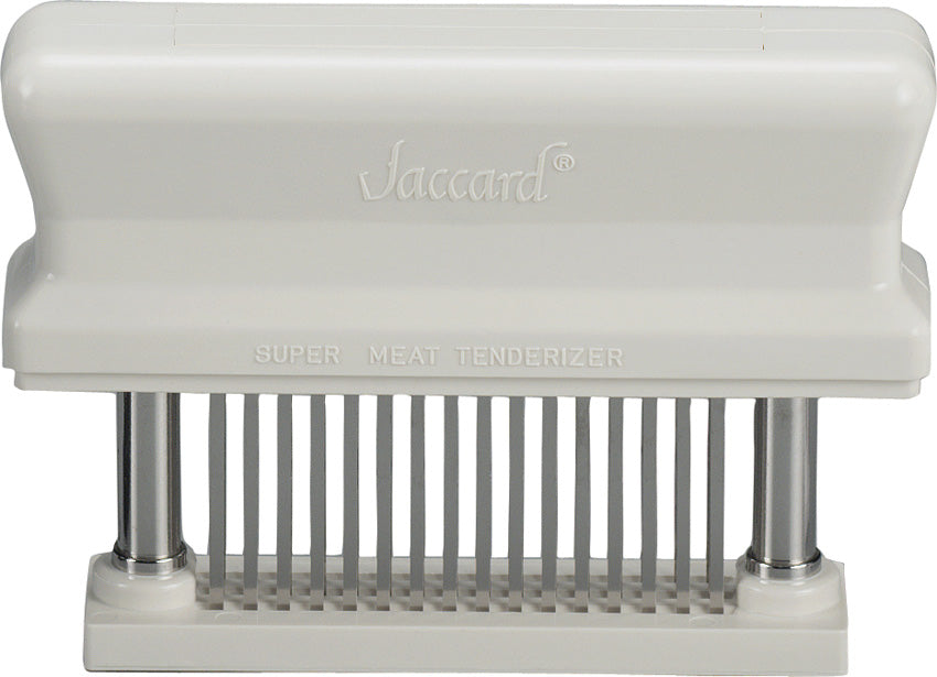 Meat Tenderizer. Contains 48 knife blades. Stainless side columns. 5 5/8" x 4 1/8". White ABS construction. How it works - razor sharp knife blades cut through the connective tissues that make meat tough. Tiny "heat channels" are created without changing the shape or appearance of the meat resulting in faster penetration of marinades, even cooking throughout the meat and significantly reduced cooking times - up to 40%. Hang packaged.